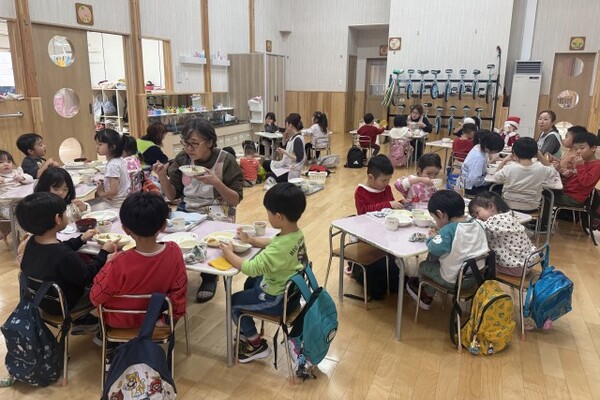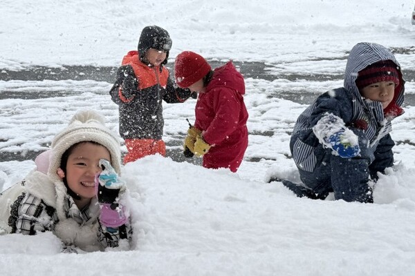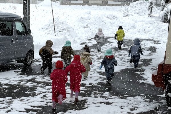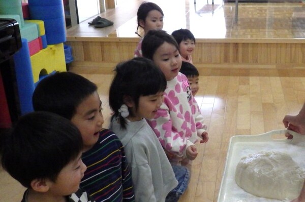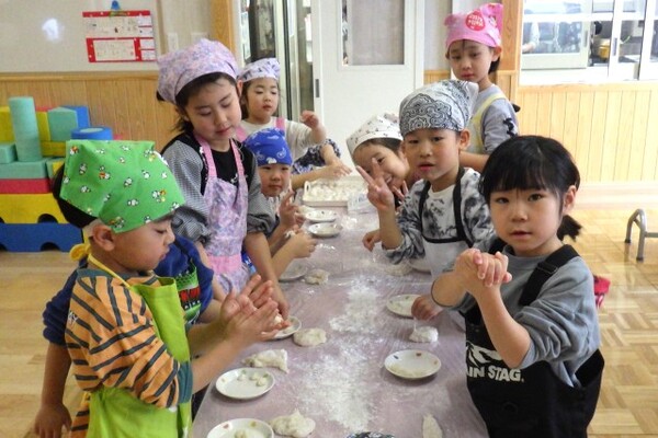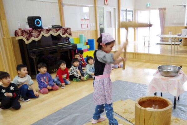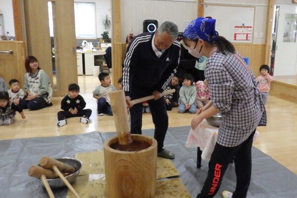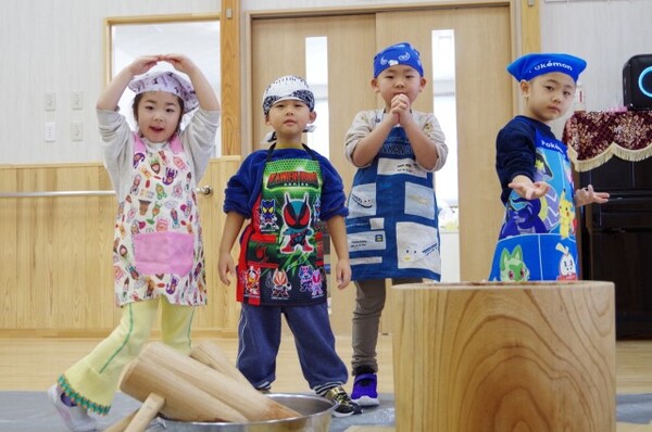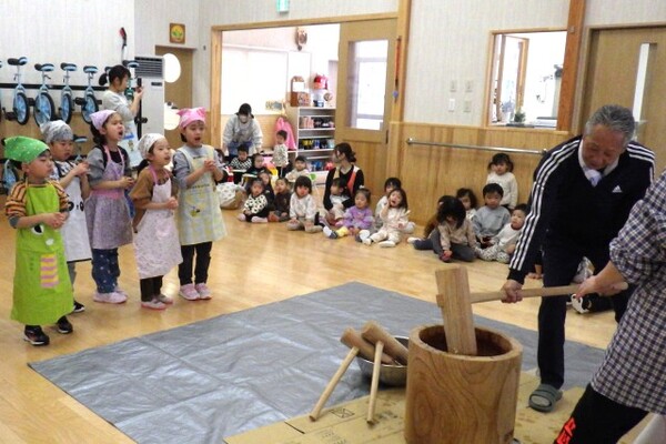 1月8日、もちつき会が行われました。「よいしょーっ!」という元気な掛け声とともに、園長先生の杵が振り下ろされ、ペッタンペッタンと心地よい音が響くなか、あっという間におもちが出来上がりました。出来立てのおもちにみんなくぎ付け!きな粉をまぶしておもちを味見し、「おいし〜♪」と感動!!子ども達も小さな杵でもちつきを体験しました。エプロンと三角巾を身に付けたさくらさんは、自分で食べるおもちを小さくコロコロ丸め、お雑煮に入れてみんなで美味しくいただきました!