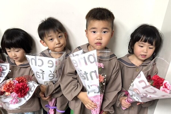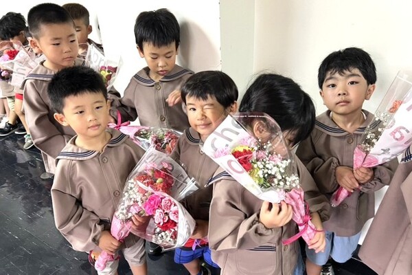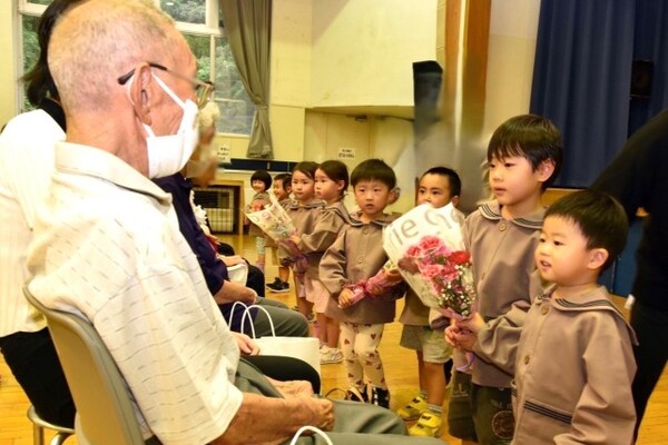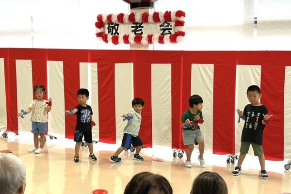 9月2日、福祉センターで長寿福祉祭が執り行われました。さくら・ひまわり組は地域のおじいちゃん、おばあちゃんに花束を贈呈するという大切な役目を任されました。緊張気味の子ども達でしたがみなさん笑顔で受け取ってくださり、とてもあたたかい気持ちになりました。その後鼓笛演奏とよさこいを披露し、たくさんの拍手をいただきました。おじいちゃん、おばあちゃんこれからも元気で長生きしてくださいね!!