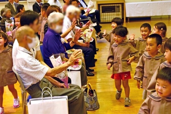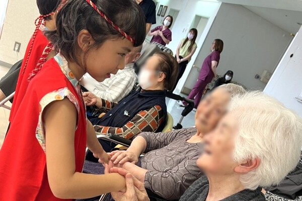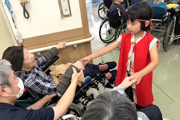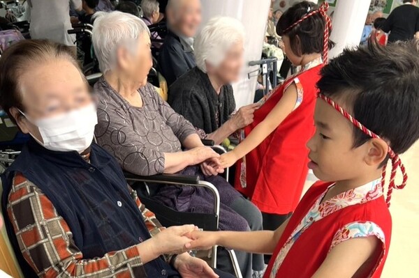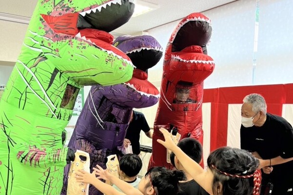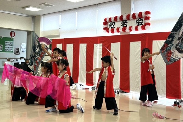 9月10日、大鰐ホームさんの敬老会にお招きいただき、おじいちゃん、おばあちゃんとの触れ合いを楽しんできました!たくさんのおじいちゃん、おばあちゃんが笑顔で迎えてくれ、鼓笛演奏や年中さんのおゆうぎを披露しました。手と手を取り合い、曲に合わせて行ったふれ合い遊びでは、涙を流して喜んでくれたおじいちゃんおばあちゃんもいて、私たち職員もウルっとしてしまいました。最後のよさこい披露後にはなんと恐竜が現れ、お菓子のお土産をいただいた子ども達!!短い時間ではありましたが、おじいちゃんおばあちゃんの笑顔がたくさん見れて嬉しかったです!これからも長生きしてくださいね!!大鰐ホームのみなさん、ありがとうございました。